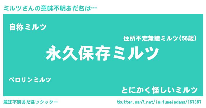 | 胡散臭い通販商品みたいなあだ名 | 『来世でも幸せになれる水素水…その名も「ミルツ」』 |