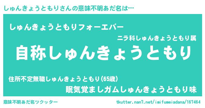 | 女子向けラノベタイトル風あだ名 | 『しゅんきょうともりなんてお断りですっ。』 |