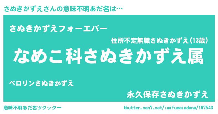 | 男性向けラノベタイトル風あだ名 | 『はたらくさぬきかずえさま!』 |