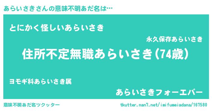 | 男性向けラノベタイトル風あだ名 | 『この素晴らしい世界にあらいさきを!』 |