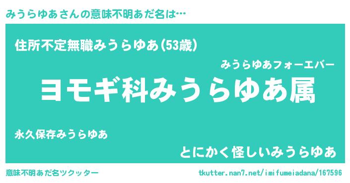 | 男性向けラノベタイトル風あだ名 | 『みうらゆあ~年齢イコール彼女いない歴の魔法使い~』 |