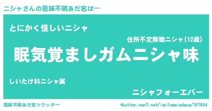| 男性向けラノベタイトル風あだ名 | 『ニシャに滅ぼされるだけの簡単なお仕事です』 |
