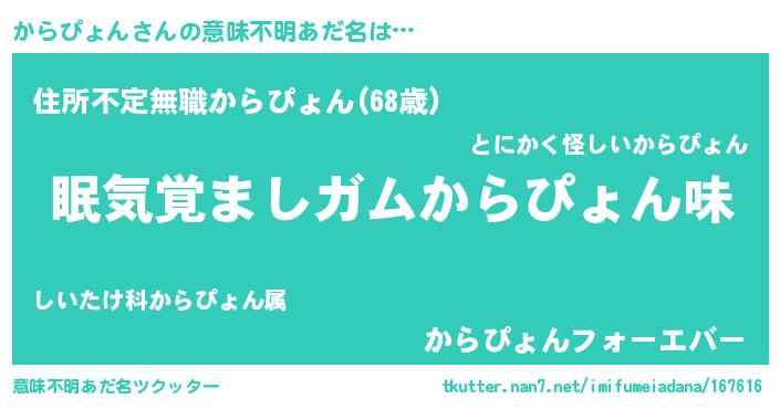 | 男性向けラノベタイトル風あだ名 | 『ノーゲーム・ノーカラピョン』 |