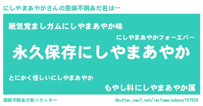 | 男性向けラノベタイトル風あだ名 | 『にしやまあやかという概念が存在しない退屈な世界 』 |