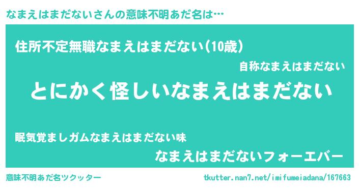 | ポケモン風あだ名 | 『ヒナマエハマダナイ』『ナマゴンZ』 |