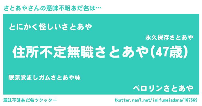 | 女子向けラノベタイトル風あだ名 | 『さとあやが死なない童話 林檎のさとあやの診療簿』 |