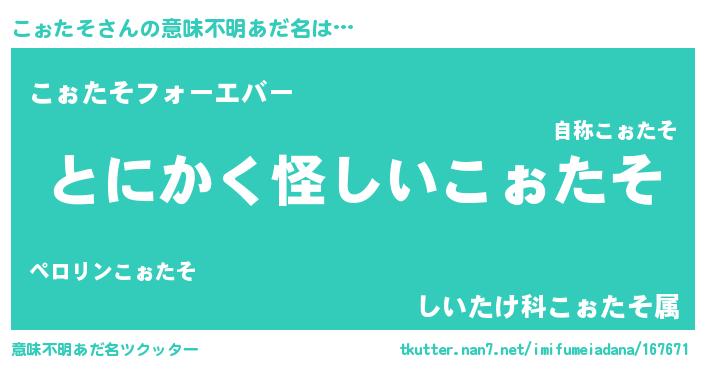 | ヒーロー風カッコイイあだ名 | 『魔戒騎士コォ』『ウルトラこぉたそマン』 |