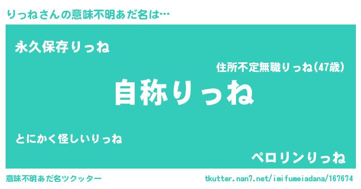 | 男性向けラノベタイトル風あだ名 | 『Re:りっねから始める異世界生活』 |