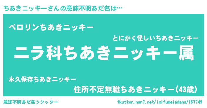 | 男性向けラノベタイトル風あだ名 | 『ちあきニッキー~年齢イコール彼女いない歴の魔法使い~』 |