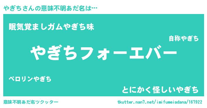 | 女子向けラノベタイトル風あだ名 | 『やぎちの雑貨屋さん』『闇のやぎち』 |