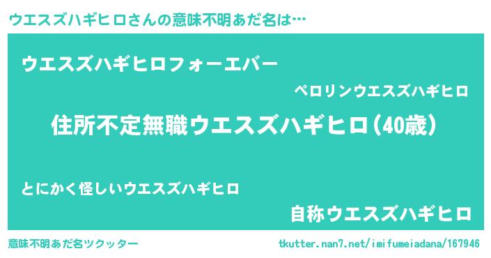 | 男性向けラノベタイトル風あだ名 | 『この素晴らしい世界にウエスズハギヒロを!』 |