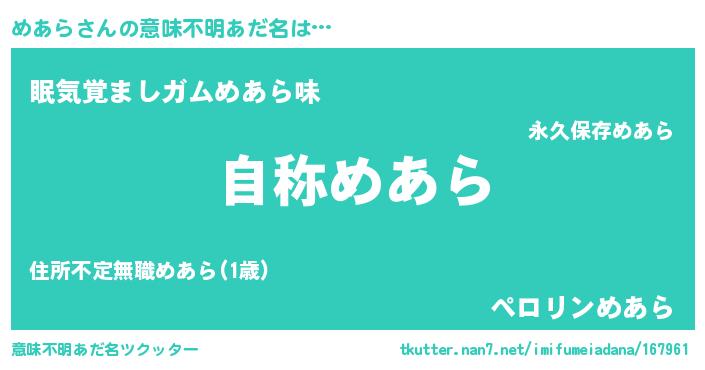 | 男性向けラノベタイトル風あだ名 | 『Re:めあらから始める異世界生活』 |