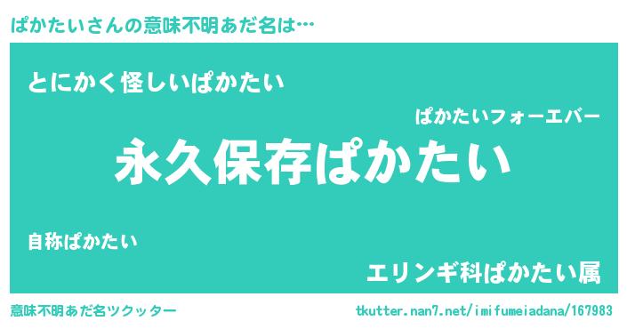 | 男性向けラノベタイトル風あだ名 | 『ぱかたいという概念が存在しない退屈な世界 』 |