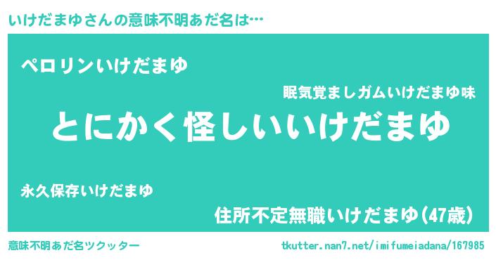 | 男性向けラノベタイトル風あだ名 | 『いけだまゆの嫁は女の子じゃないと思った?』 |