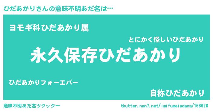 | 男性向けラノベタイトル風あだ名 | 『ひだあかりに滅ぼされるだけの簡単なお仕事です』 |