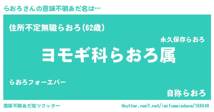 | 男性向けラノベタイトル風あだ名 | 『らおろ~年齢イコール彼女いない歴の魔法使い~』 |