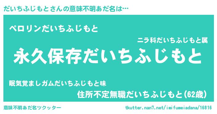 | 男性向けラノベタイトル風あだ名 | 『だいちふじもとという概念が存在しない退屈な世界 』 |