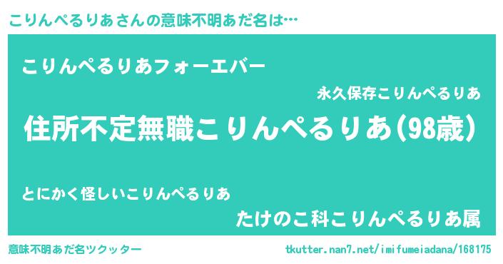 | 女子向けラノベタイトル風あだ名 | 『乙女ゲームの破滅フラグしかない悪役こりんぺるりあに転生してしまった…』 |