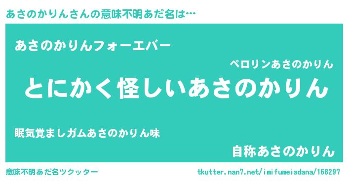 | 男性向けラノベタイトル風あだ名 | 『あさのかりんの嫁は女の子じゃないと思った?』 |