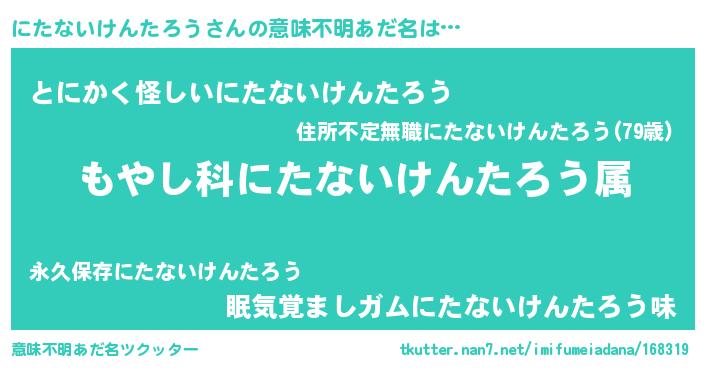 | 男性向けラノベタイトル風あだ名 | 『転生したらにたないけんたろうだった件』 |