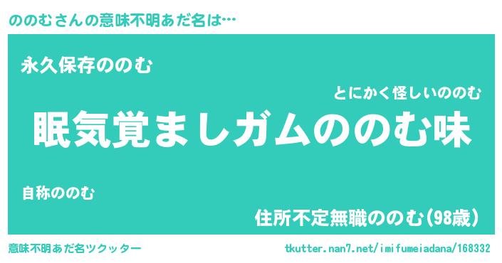 | 女子向けラノベタイトル風あだ名 | 『死神ののむの再婚』『ののむ様がみてる』 |
