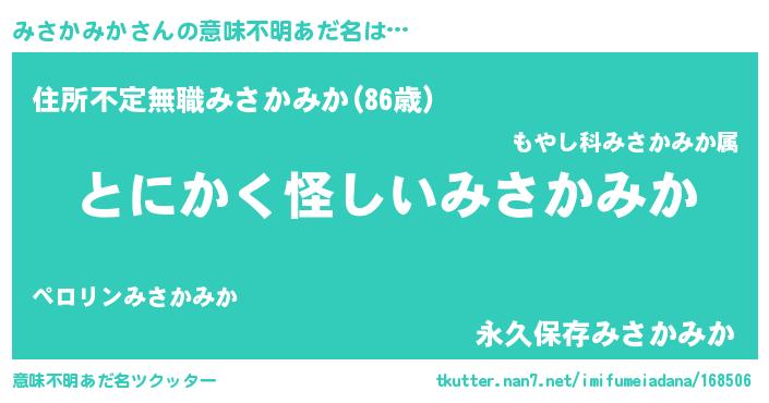 | 男性向けラノベタイトル風あだ名 | 『みさかみかの嫁は女の子じゃないと思った?』 |