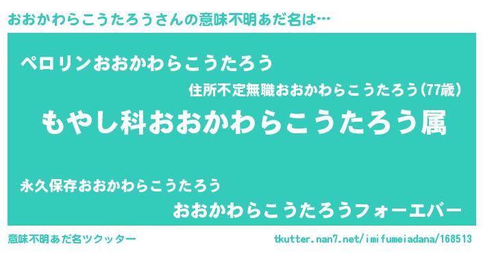 | 男性向けラノベタイトル風あだ名 | 『おおかわらこうたろうに滅ぼされるだけの簡単なお仕事です』 |