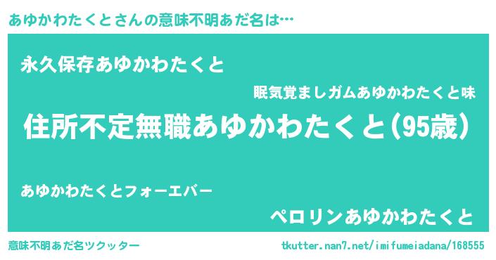 | ヘコむあだ名 | 『あゆかわたくと(遠い目)』『あゆもー』 |