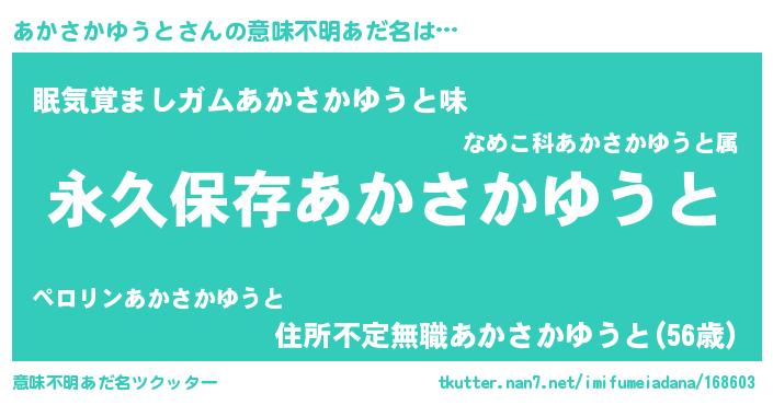 | ヘコむあだ名 | 『あかさかゆうと(笑)』『あかにゅー』 |