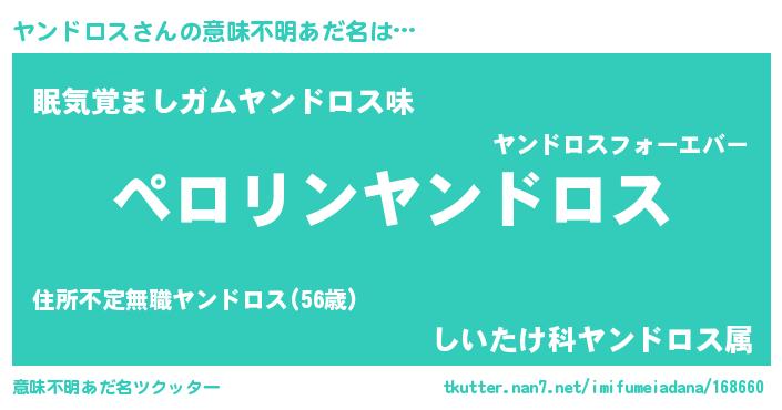 | 男性向けラノベタイトル風あだ名 | 『ヤンドロスアートオンライン』 |