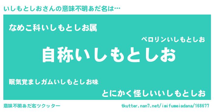 | ヒーロー風カッコイイあだ名 | 『究極戦士イシモトシオ』『銀牙騎士イシ』 |