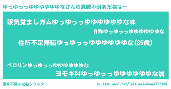 | 女子向けラノベタイトル風あだ名 | 『ゆっゆっっゆゆゆゆゆゆなが死なない童話 林檎のゆっゆっっゆゆゆゆゆゆなの診療簿』 |