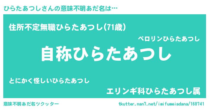 | 男性向けラノベタイトル風あだ名 | 『Re:ひらたあつしから始める異世界生活』 |