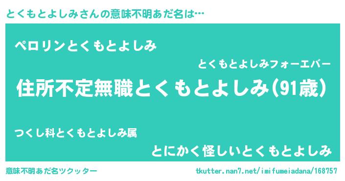 | 男性向けラノベタイトル風あだ名 | 『魔弾の王ととくもとよしみ』 |