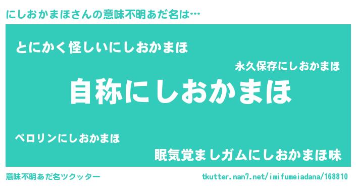 | 女子向けラノベタイトル風あだ名 | 『にしおかまほなんてお断りですっ。』 |
