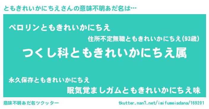 | 男性向けラノベタイトル風あだ名 | 『ともきれいかにちえ~年齢イコール彼女いない歴の魔法使い~』 |
