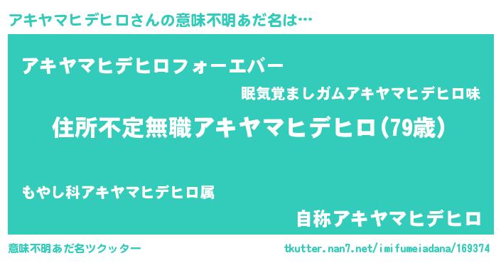 | 男性向けラノベタイトル風あだ名 | 『アキヤマヒデヒロに滅ぼされるだけの簡単なお仕事です』 |