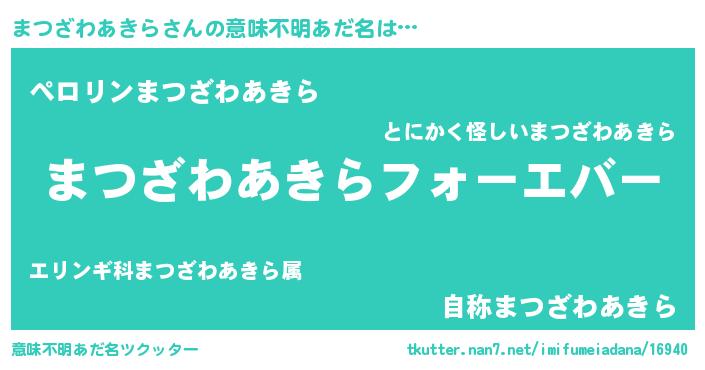 | 男性向けラノベタイトル風あだ名 | 『やはりまつざわあきらの青春ラブコメはまちがっている 』 |