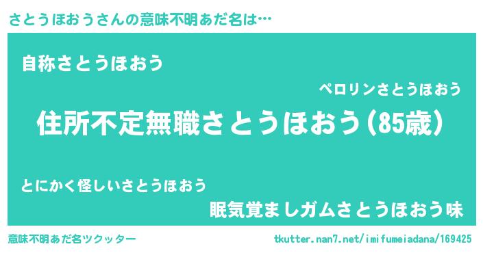 | 男性向けラノベタイトル風あだ名 | 『この素晴らしい世界にさとうほおうを!』 |