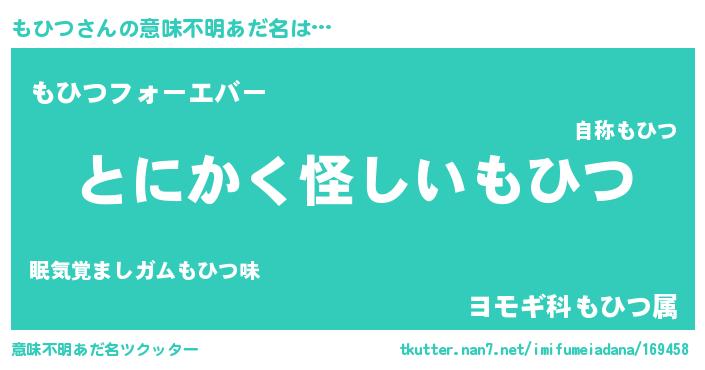 | 男性向けラノベタイトル風あだ名 | 『もひつの嫁は女の子じゃないと思った?』 |