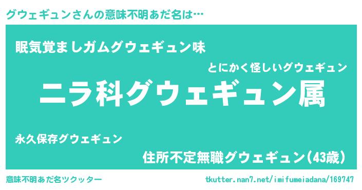 | 男性向けラノベタイトル風あだ名 | 『グウェギュン~年齢イコール彼女いない歴の魔法使い~』 |