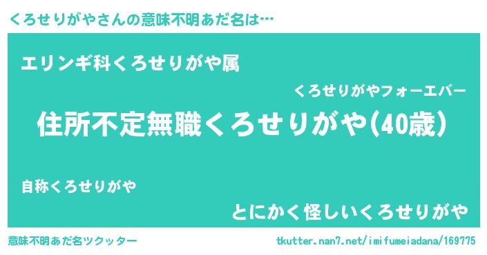 | 男性向けラノベタイトル風あだ名 | 『この素晴らしい世界にくろせりがやを!』 |