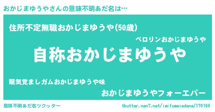 | 男性向けラノベタイトル風あだ名 | 『Re:おかじまゆうやから始める異世界生活』 |