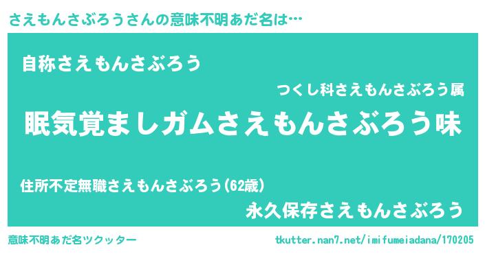 | 男性向けラノベタイトル風あだ名 | 『ノーゲーム・ノーサエモンサブロウ』 |