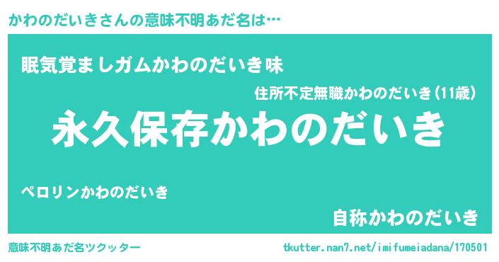 | 胡散臭い通販商品みたいなあだ名 | 『来世でも幸せになれる水素水…その名も「かわのだいき」』 |