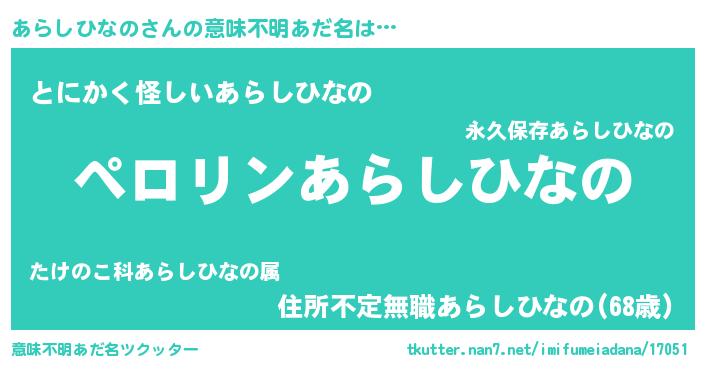 | 男性向けラノベタイトル風あだ名 | 『あらしひなのの憂鬱』 |