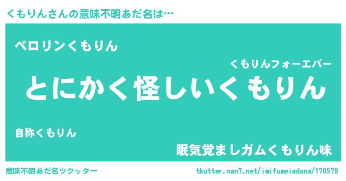 | 男性向けラノベタイトル風あだ名 | 『ダンジョンにくもりんを求めるのは間違っているだろうか』 |