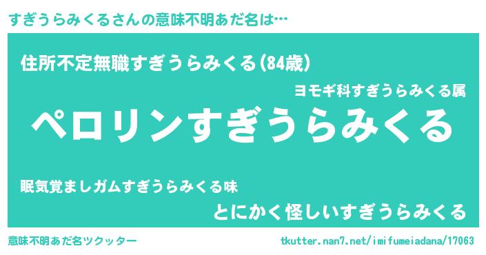 | 胡散臭い通販商品みたいなあだ名 | 『必ず成功するブレスレット…その名も「すぎうらみくる」』 |