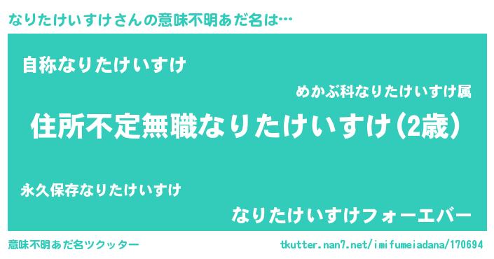| 男性向けラノベタイトル風あだ名 | 『魔弾の王となりたけいすけ』 |