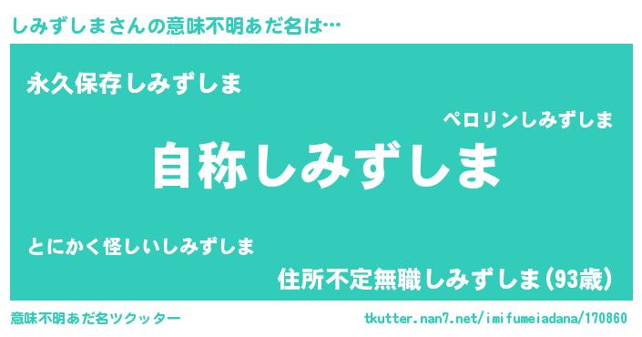 | 女子向けラノベタイトル風あだ名 | 『しみずしまなんてお断りですっ。』 |
